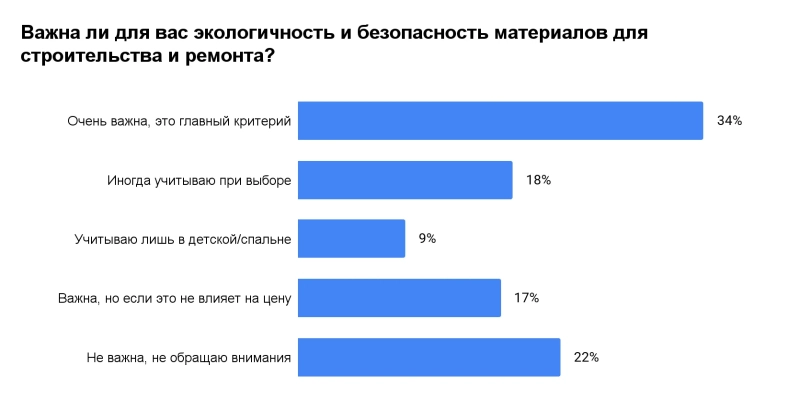 Между тем, эксперты ассоциации РОСИЗОЛ выяснили, что экологичность и безопасность при выборе стройматериалов и товаров для ремонта являются главным критерием всего для 34% россиян. Еще 18% учитывают эти факторы лишь иногда, 17% — только если они не влияют на цену, а 9% — исключительно при ремонте детской комнаты или спальни. Оставшиеся 22% опрошенных признают, что экологичность стройматериалов для них вообще не имеет никакого значения.