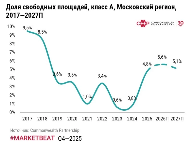 «В 2026 году доля свободных площадей может показать волатильность. Так, в первом полугодии 2026 года показатель достигнет пикового значения за год. Во втором полугодии при смягчении эконмического фона доля свободных площадей будет снижаться и по итогам 2026 года зафиксируется на уровне 5,6%. Показатель по итогам 2027 года, ожидается, снизится до 5,1%», – прогнозирует руководитель департамента исследований и аналитики CMWP Полина Афанасьева.