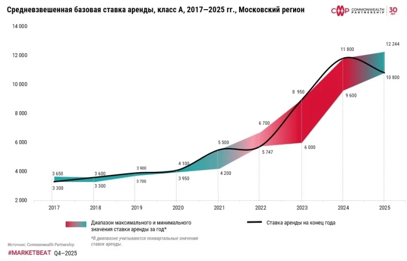 Ставка аренды по итогам 2025 года снизилась на 10% по сравнению с рекордным уровнем первого квартала и стабилизировалась на уровне 10 800 руб. / кв. м / год. Снижение ставок аренды отражается в ширине диапазона запрашиваемых ставок аренды. Так, по итогам 2025 года 42% коммерческих условий маркетировались ниже 11 000 руб. / кв. м / год (+36 п. п. г/г). Ожидается, что в 2026 году ставка аренды не покажет значительного роста и составит в среднем 11 000 руб. / кв. м / год. На протяжение 2027 года ставка аренды будет расти в пределах инфляции и может достичь уровня 12 000 руб. / кв. м / год.